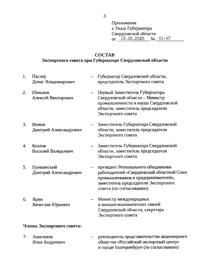 Указ Губернатора Свердловской области от 18.02.2026 N 61-УГ "О внесении изменений в Указ Губернатора Свердловской области от 13.12.2017 N 640-УГ "Об Экспортном совете при Губернаторе Свердловской области"