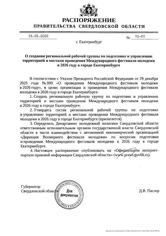 Распоряжение Правительства Свердловской области от 18.02.2026 N 70-РП "О создании региональной рабочей группы по подготовке и управлению территорией и местами проведения Международного фестиваля молодежи в 2026 году в городе Екатеринбурге"