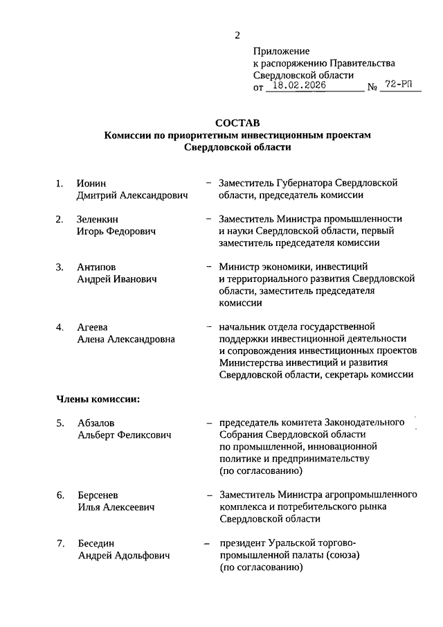 Распоряжение Правительства Свердловской области от 18.02.2026 N 72-РП "О внесении изменений в состав Комиссии по приоритетным инвестиционным проектам Свердловской области, утвержденный Распоряжением Правительства Свердловской области от 21.03.2017 N 264-РП"