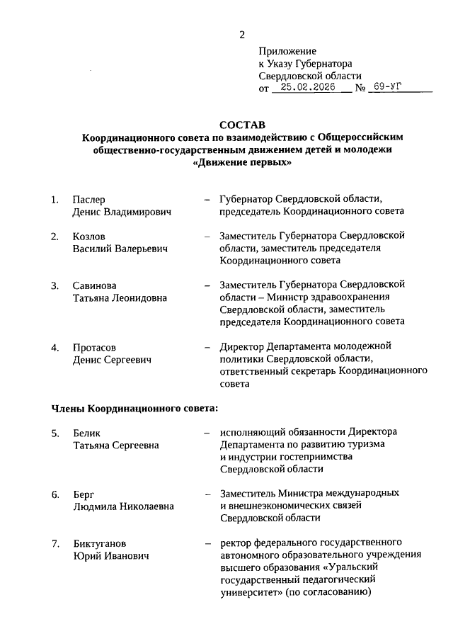 Указ Губернатора Свердловской области от 25.02.2026 N 69-УГ "О внесении изменений в состав Координационного совета по взаимодействию с Общероссийским общественно-государственным движением детей и молодежи "Движение первых", утвержденный Указом Губернатора Свердловской области от 23.12.2022 N 673-УГ"