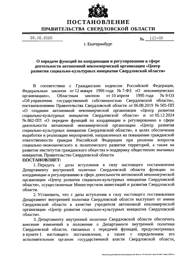 Постановление Правительства Свердловской области от 26.02.2026 N 110-ПП "О передаче функций по координации и регулированию в сфере деятельности автономной некоммерческой организации "Центр развития социально-культурных инициатив Свердловской области"