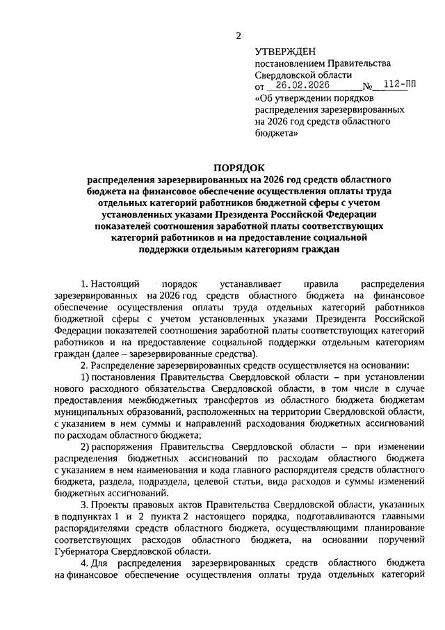 Постановление Правительства Свердловской области от 26.02.2026 N 112-ПП "Об утверждении порядков распределения зарезервированных на 2026 год средств областного бюджета" (вместе с "Порядком распределения зарезервированных на 2026 год средств областного бюджета на финансовое обеспечение осуществления оплаты труда отдельных категорий работников бюджетной сферы с учетом установленных указами Президента Российской Федерации показателей соотношения заработной платы соответствующих категорий работников и на предоставление социальной поддержки отдельным категориям граждан", "Порядком распределения зарезервированных на 2026 год средств областного бюджета на обеспечение финансовой устойчивости функционирования государственной системы здравоохранения Свердловской области", "Порядком распределения зарезервированных на 2026 год средств областного бюджета на финансовое обеспечение затрат, связанных с подготовкой и проведением на территории Свердловской области значимых официальных физкультурных мероприятий и спортивных мероприятий")