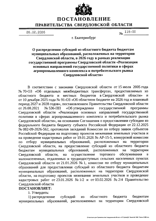 Постановление Правительства Свердловской области от 26.02.2026 N 118-ПП "О распределении субсидий из областного бюджета бюджетам муниципальных образований, расположенных на территории Свердловской области, в 2026 году в рамках реализации государственной программы Свердловской области "Реализация основных направлений государственной политики в сферах агропромышленного комплекса и потребительского рынка Свердловской области"