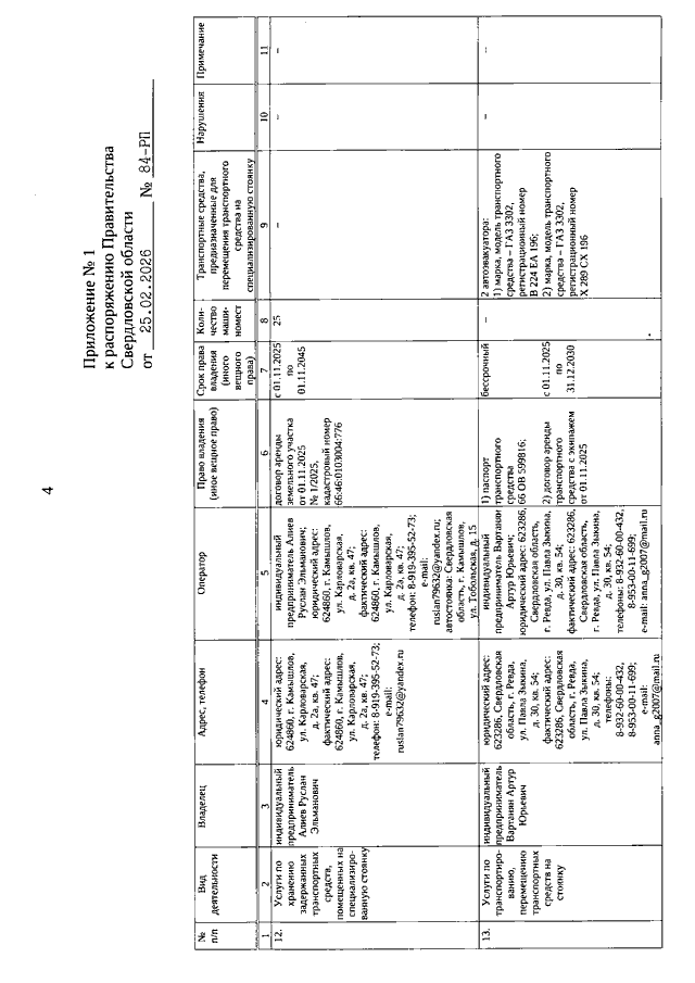 Распоряжение Правительства Свердловской области от 25.02.2026 N 84-РП "О внесении изменений в Перечень юридических лиц и индивидуальных предпринимателей, осуществляющих на территории Свердловской области деятельность по перемещению транспортных средств на специализированную стоянку и (или) деятельность по хранению транспортных средств, помещенных на специализированную стоянку, утвержденный Распоряжением Правительства Свердловской области от 13.09.2012 N 1795-РП"