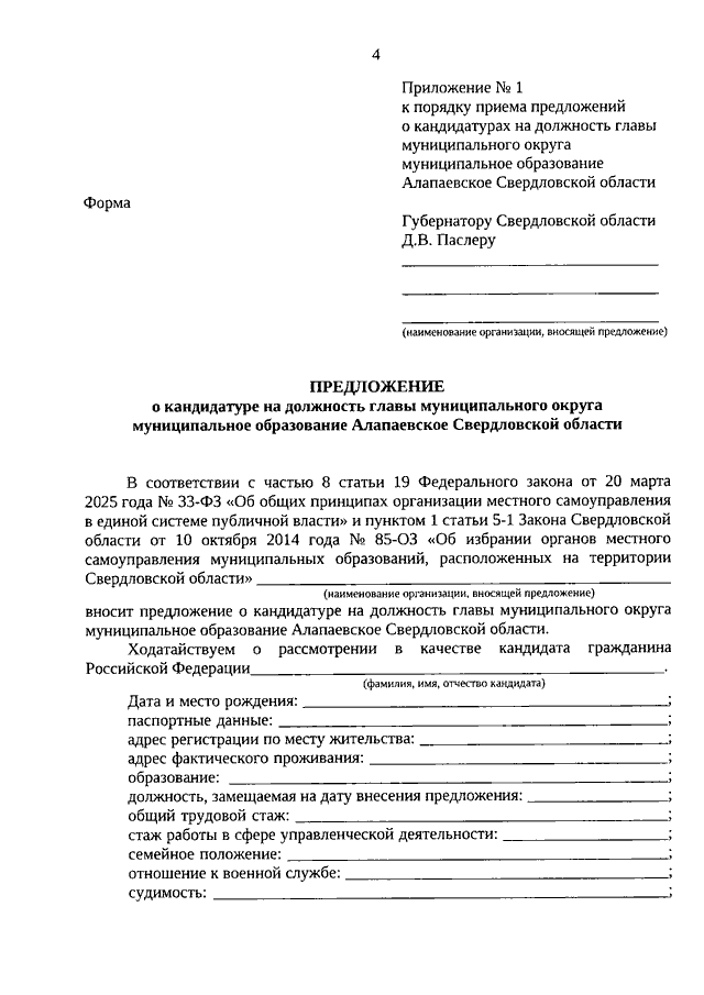 Указ Губернатора Свердловской области от 27.02.2026 N 74-УГ "О предварительном рассмотрении кандидатов на должность главы муниципального округа муниципальное образование Алапаевское Свердловской области" (вместе с "Порядком приема предложений о кандидатурах на должность главы муниципального округа муниципальное образование Алапаевское Свердловской области", "Перечнем документов, прилагаемых к предложениям о кандидатурах на должность главы муниципального округа муниципальное образование Алапаевское Свердловской области", "Порядком деятельности комиссии по рассмотрению кандидатур на должность главы муниципального округа муниципальное образование Алапаевское Свердловской области")