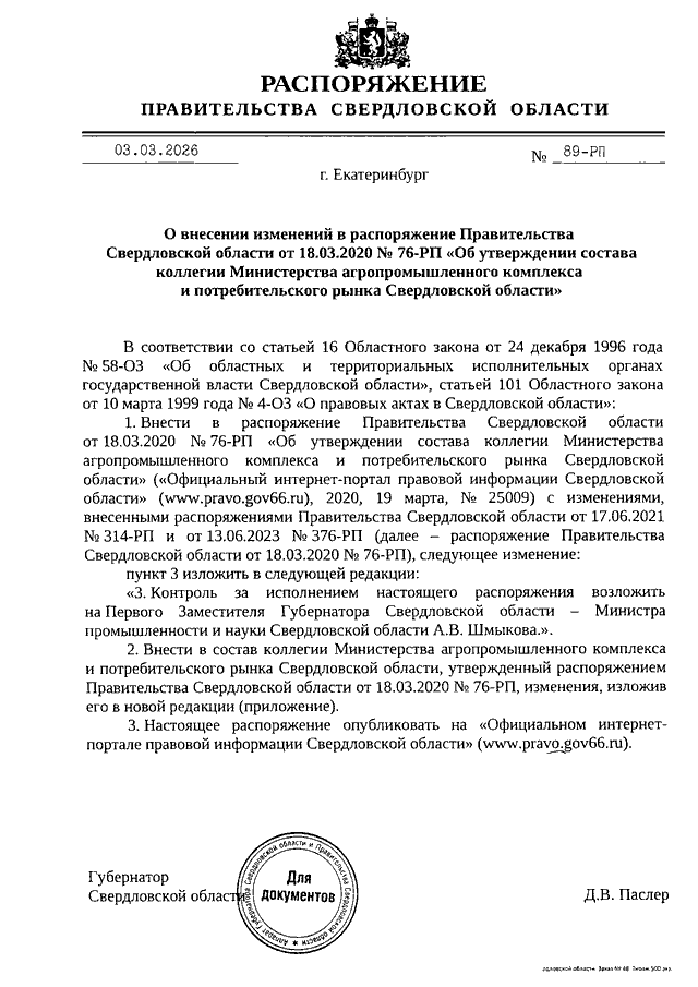 Распоряжение Правительства Свердловской области от 03.03.2026 N 89-РП "О внесении изменений в Распоряжение Правительства Свердловской области от 18.03.2020 N 76-РП "Об утверждении состава коллегии Министерства агропромышленного комплекса и потребительского рынка Свердловской области"