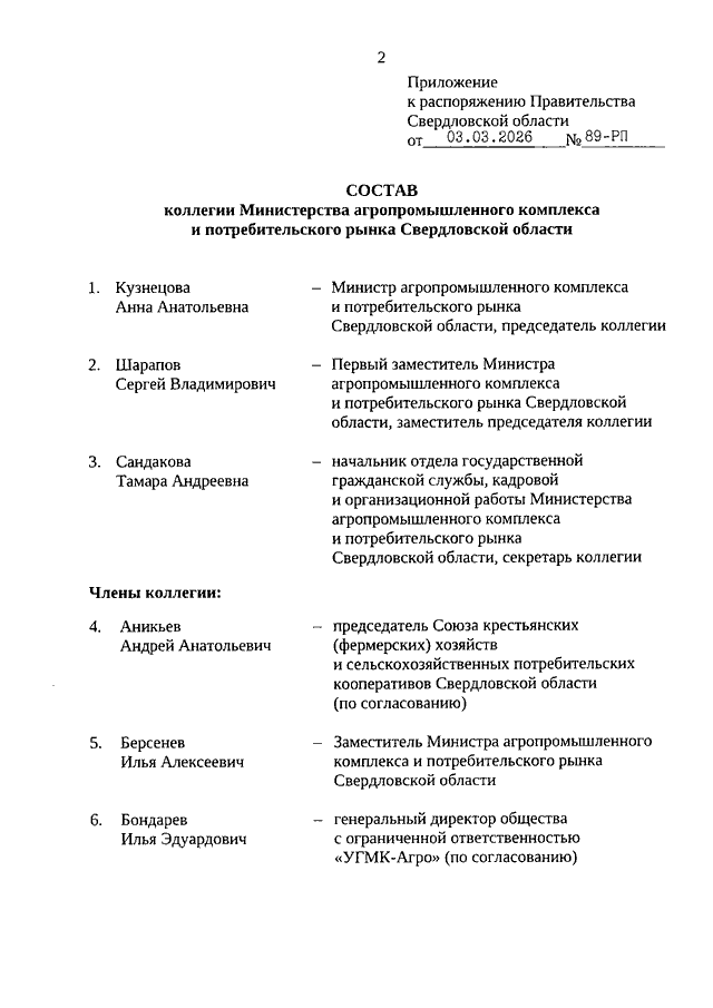 Распоряжение Правительства Свердловской области от 03.03.2026 N 89-РП "О внесении изменений в Распоряжение Правительства Свердловской области от 18.03.2020 N 76-РП "Об утверждении состава коллегии Министерства агропромышленного комплекса и потребительского рынка Свердловской области"