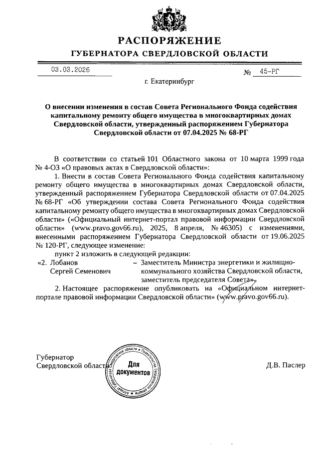 Распоряжение Губернатора Свердловской области от 03.03.2026 N 45-РГ "О внесении изменения в состав Совета Регионального Фонда содействия капитальному ремонту общего имущества в многоквартирных домах Свердловской области, утвержденный Распоряжением Губернатора Свердловской области от 07.04.2025 N 68-РГ"