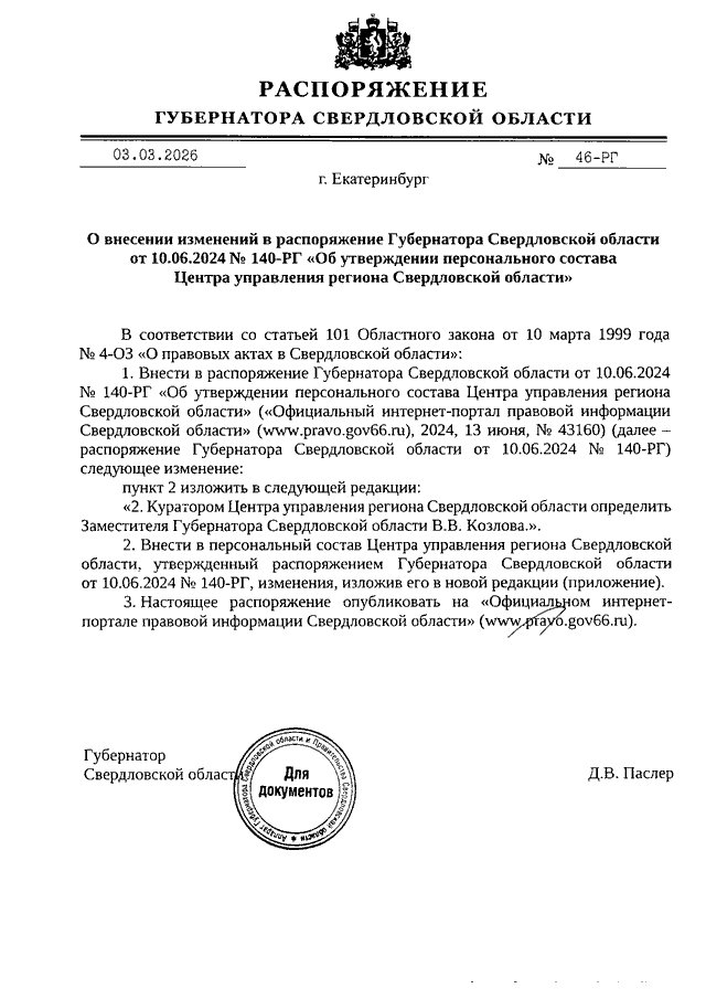 Распоряжение Губернатора Свердловской области от 03.03.2026 N 46-РГ "О внесении изменений в Распоряжение Губернатора Свердловской области от 10.06.2024 N 140-РГ "Об утверждении персонального состава Центра управления региона Свердловской области"