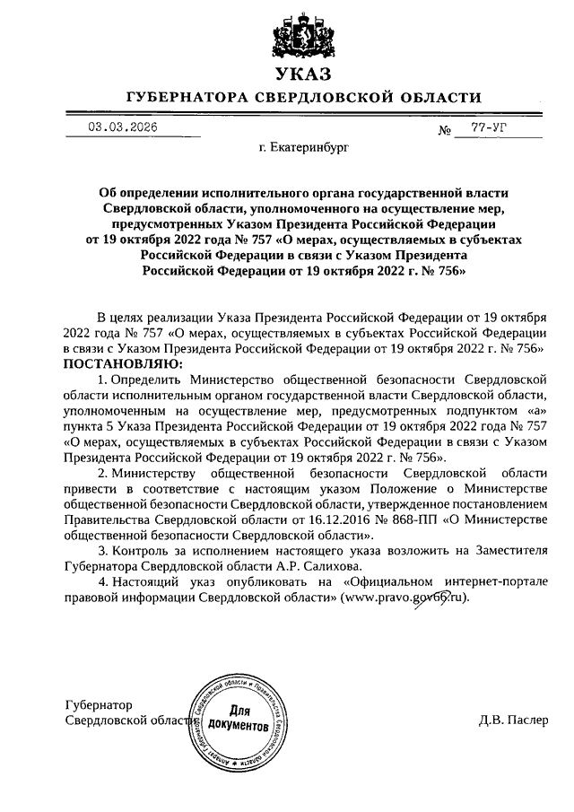 Указ Губернатора Свердловской области от 03.03.2026 N 77-УГ "Об определении исполнительного органа государственной власти Свердловской области, уполномоченного на осуществление мер, предусмотренных Указом Президента Российской Федерации от 19 октября 2022 года N 757 "О мерах, осуществляемых в субъектах Российской Федерации в связи с Указом Президента Российской Федерации от 19 октября 2022 г. N 756"