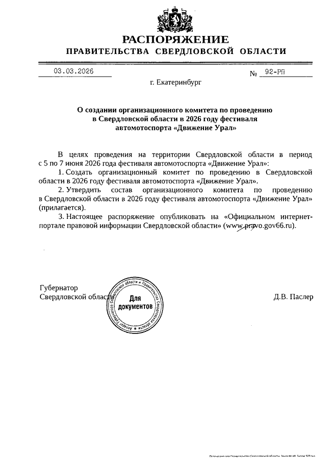 Распоряжение Правительства Свердловской области от 03.03.2026 N 92-РП "О создании организационного комитета по проведению в Свердловской области в 2026 году фестиваля автомотоспорта "Движение Урал"