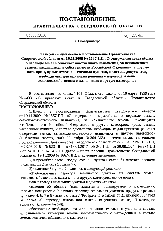 Постановление Правительства Свердловской области от 05.03.2026 N 125-ПП "О внесении изменений в Постановление Правительства Свердловской области от 19.11.2009 N 1667-ПП "О содержании ходатайства о переводе земель сельскохозяйственного назначения, за исключением земель, находящихся в собственности Российской Федерации, в другую категорию, кроме земель населенных пунктов, и составе документов, необходимых для принятия решения о переводе земель сельскохозяйственного назначения в другую категорию"