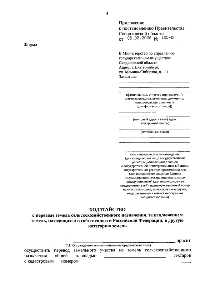 Постановление Правительства Свердловской области от 05.03.2026 N 125-ПП "О внесении изменений в Постановление Правительства Свердловской области от 19.11.2009 N 1667-ПП "О содержании ходатайства о переводе земель сельскохозяйственного назначения, за исключением земель, находящихся в собственности Российской Федерации, в другую категорию, кроме земель населенных пунктов, и составе документов, необходимых для принятия решения о переводе земель сельскохозяйственного назначения в другую категорию"
