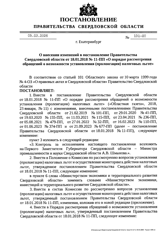 Постановление Правительства Свердловской области от 05.03.2026 N 131-ПП "О внесении изменений в Постановление Правительства Свердловской области от 18.01.2018 N 11-ПП "О порядке рассмотрения обращений о возможности установления (пролонгации) налоговых льгот"