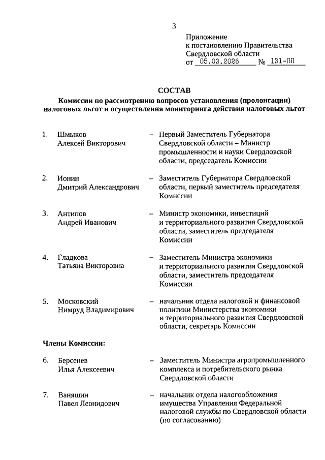 Постановление Правительства Свердловской области от 05.03.2026 N 131-ПП "О внесении изменений в Постановление Правительства Свердловской области от 18.01.2018 N 11-ПП "О порядке рассмотрения обращений о возможности установления (пролонгации) налоговых льгот"