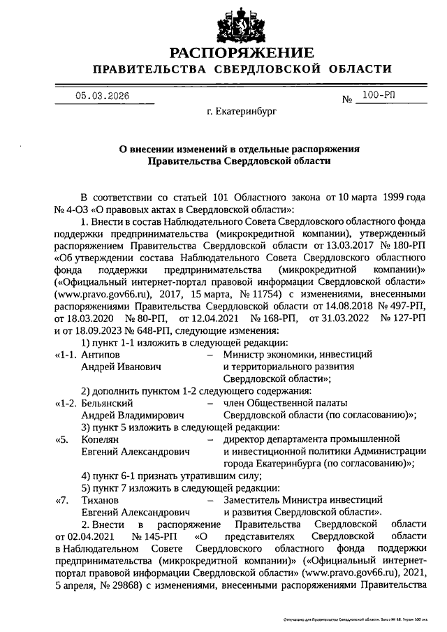 Распоряжение Правительства Свердловской области от 05.03.2026 N 100-РП "О внесении изменений в отдельные распоряжения Правительства Свердловской области"