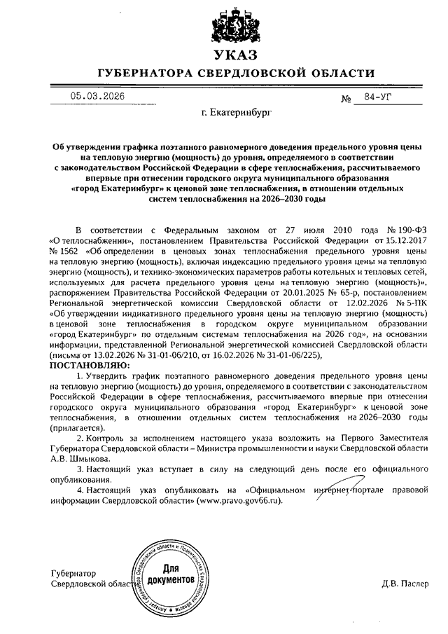 Указ Губернатора Свердловской области от 05.03.2026 N 84-УГ "Об утверждении графика поэтапного равномерного доведения предельного уровня цены на тепловую энергию (мощность) до уровня, определяемого в соответствии с законодательством Российской Федерации в сфере теплоснабжения, рассчитываемого впервые при отнесении городского округа муниципального образования "город Екатеринбург" к ценовой зоне теплоснабжения, в отношении отдельных систем теплоснабжения на 2026 - 2030 годы"