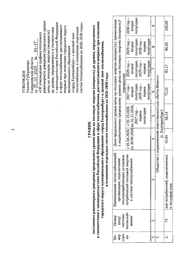 Указ Губернатора Свердловской области от 05.03.2026 N 84-УГ "Об утверждении графика поэтапного равномерного доведения предельного уровня цены на тепловую энергию (мощность) до уровня, определяемого в соответствии с законодательством Российской Федерации в сфере теплоснабжения, рассчитываемого впервые при отнесении городского округа муниципального образования "город Екатеринбург" к ценовой зоне теплоснабжения, в отношении отдельных систем теплоснабжения на 2026 - 2030 годы"