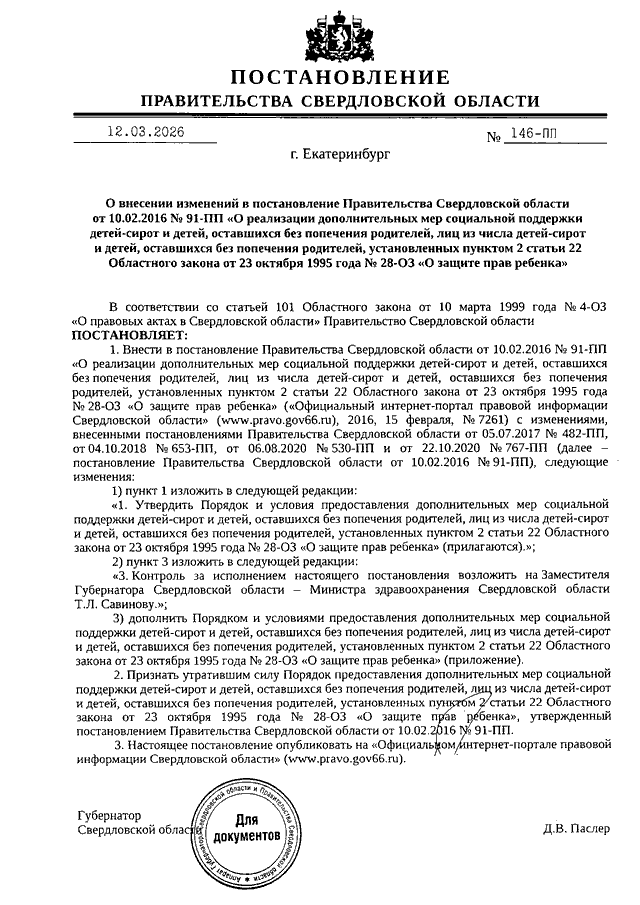 Постановление Правительства Свердловской области от 12.03.2026 N 146-ПП "О внесении изменений в Постановление Правительства Свердловской области от 10.02.2016 N 91-ПП "О реализации дополнительных мер социальной поддержки детей-сирот и детей, оставшихся без попечения родителей, лиц из числа детей-сирот и детей, оставшихся без попечения родителей, установленных пунктом 2 статьи 22 Областного закона от 23 октября 1995 года N 28-ОЗ "О защите прав ребенка"