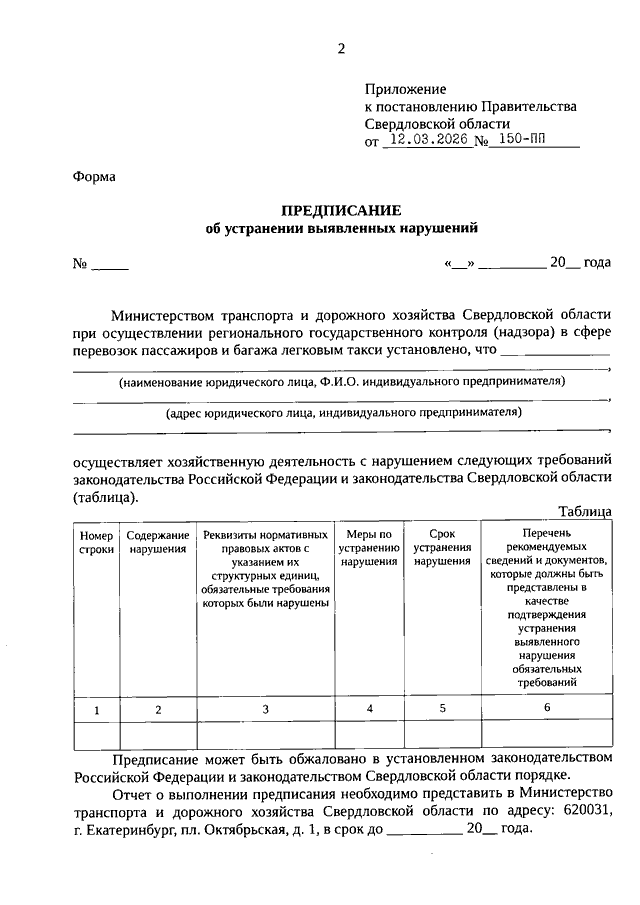 Постановление Правительства Свердловской области от 12.03.2026 N 150-ПП "О внесении изменений в Положение о региональном государственном контроле (надзоре) в сфере перевозок пассажиров и багажа легковым такси, утвержденное Постановлением Правительства Свердловской области от 16.09.2021 N 591-ПП"