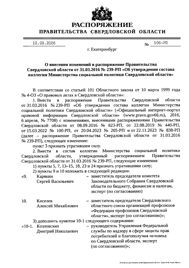Распоряжение Правительства Свердловской области от 12.03.2026 N 106-РП "О внесении изменений в Распоряжение Правительства Свердловской области от 31.03.2016 N 239-РП "Об утверждении состава коллегии Министерства социальной политики Свердловской области"