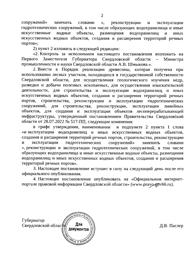 Постановление Правительства Свердловской области от 19.03.2026 N 166-ПП "О внесении изменений в Постановление Правительства Свердловской области от 28.07.2022 N 517-ПП "Об утверждении Порядка реализации древесины, которая получена при использовании лесных участков, находящихся в государственной собственности Свердловской области, для осуществления геологического изучения недр, разведки и добычи полезных ископаемых, для осуществления изыскательской деятельности, для строительства и эксплуатации водохранилищ и иных искусственных водных объектов, создания и расширения территорий речных портов, строительства, реконструкции и эксплуатации гидротехнических сооружений, для строительства, реконструкции, эксплуатации линейных объектов, для создания и эксплуатации объектов лесоперерабатывающей инфраструктуры"