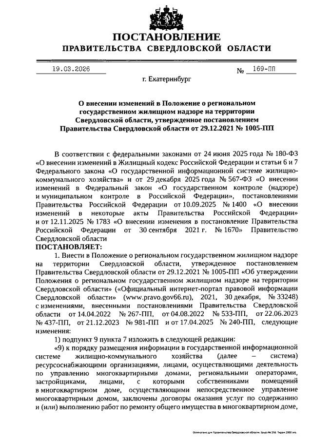 Постановление Правительства Свердловской области от 19.03.2026 N 169-ПП "О внесении изменений в Положение о региональном государственном жилищном надзоре на территории Свердловской области, утвержденное Постановлением Правительства Свердловской области от 29.12.2021 N 1005-ПП"
