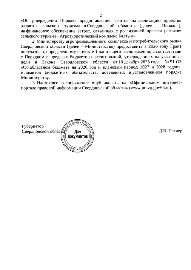 Распоряжение Губернатора Свердловской области от 19.03.2026 N 59-РГ "Об определении в 2026 году получателя гранта на реализацию проекта развития сельского туризма в Свердловской области, предоставляемого из областного бюджета на условиях софинансирования из федерального бюджета"