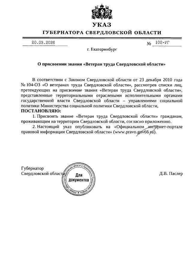 Указ Губернатора Свердловской области от 20.03.2026 N 102-УГ "О присвоении звания "Ветеран труда Свердловской области"