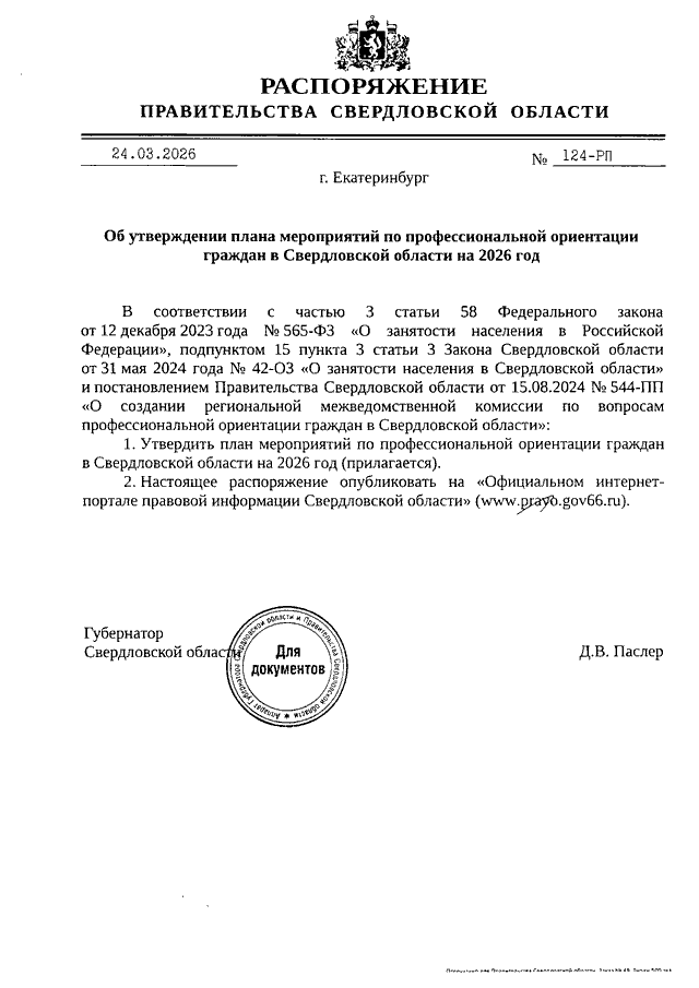 Распоряжение Правительства Свердловской области от 24.03.2026 N 124-РП "Об утверждении плана мероприятий по профессиональной ориентации граждан в Свердловской области на 2026 год"