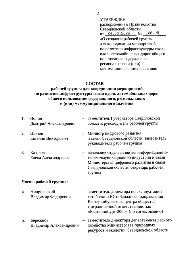 Распоряжение Правительства Свердловской области от 24.03.2026 N 126-РП "О создании рабочей группы для координации мероприятий по развитию инфраструктуры связи вдоль автомобильных дорог общего пользования федерального, регионального и (или) межмуниципального значения"