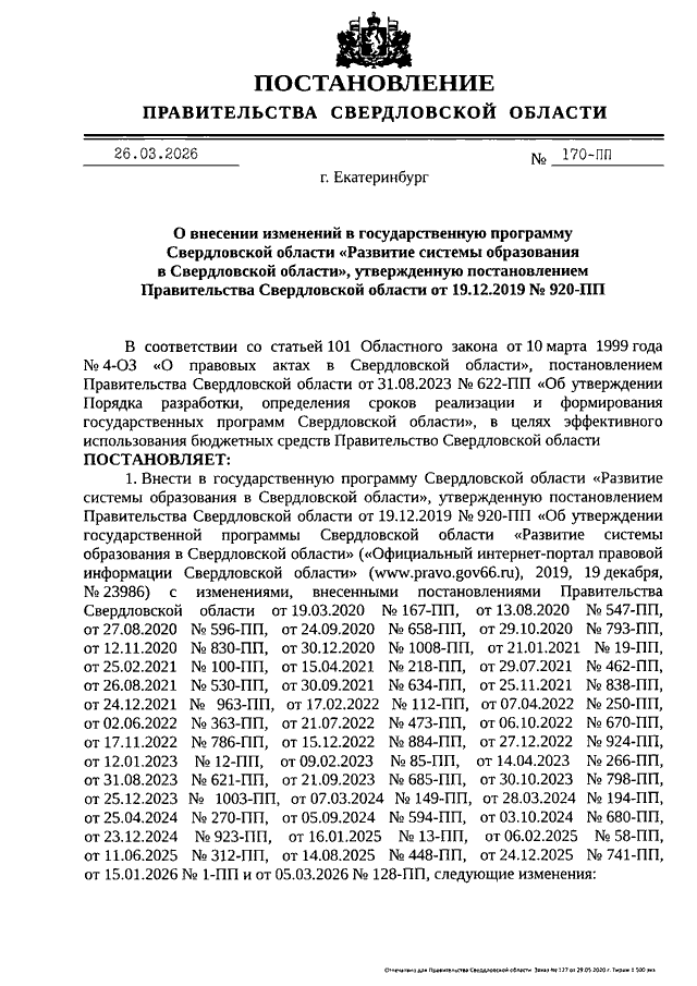 Постановление Правительства Свердловской области от 26.03.2026 N 170-ПП "О внесении изменений в государственную программу Свердловской области "Развитие системы образования в Свердловской области", утвержденную Постановлением Правительства Свердловской области от 19.12.2019 N 920-ПП"