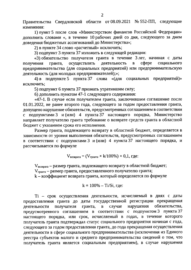 Постановление Правительства Свердловской области от 26.03.2026 N 173-ПП "О внесении изменений в Постановление Правительства Свердловской области от 08.09.2021 N 552-ПП "Об утверждении Порядка предоставления грантов в форме субсидий социальным предприятиям на реализацию проектов в сфере социального предпринимательства и (или) субъектам малого и среднего предпринимательства, созданным физическими лицами до 25 лет включительно, на реализацию проектов в сфере предпринимательской деятельности"
