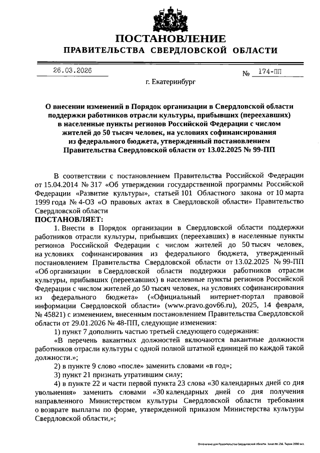 Постановление Правительства Свердловской области от 26.03.2026 N 174-ПП "О внесении изменений в Порядок организации в Свердловской области поддержки работников отрасли культуры, прибывших (переехавших) в населенные пункты регионов Российской Федерации с числом жителей до 50 тысяч человек, на условиях софинансирования из федерального бюджета, утвержденный Постановлением Правительства Свердловской области от 13.02.2025 N 99-ПП"