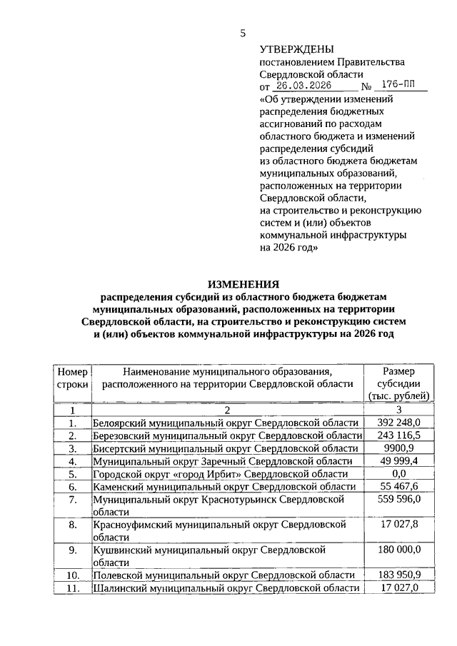 Постановление Правительства Свердловской области от 26.03.2026 N 176-ПП "Об утверждении изменений распределения бюджетных ассигнований по расходам областного бюджета и изменений распределения субсидий из областного бюджета бюджетам муниципальных образований, расположенных на территории Свердловской области, на строительство и реконструкцию систем и (или) объектов коммунальной инфраструктуры на 2026 год"