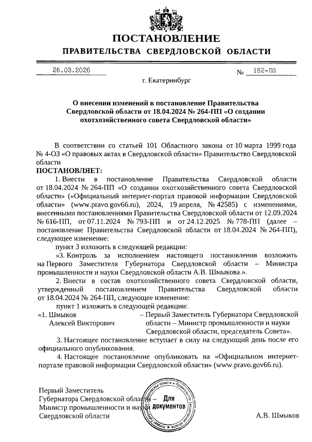 Постановление Правительства Свердловской области от 26.03.2026 N 182-ПП "О внесении изменений в Постановление Правительства Свердловской области от 18.04.2024 N 264-ПП "О создании охотхозяйственного совета Свердловской области"
