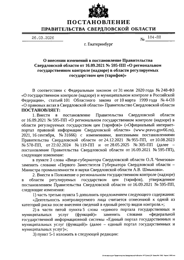 Постановление Правительства Свердловской области от 26.03.2026 N 184-ПП "О внесении изменений в Постановление Правительства Свердловской области от 16.09.2021 N 595-ПП "О региональном государственном контроле (надзоре) в области регулируемых государством цен (тарифов)"