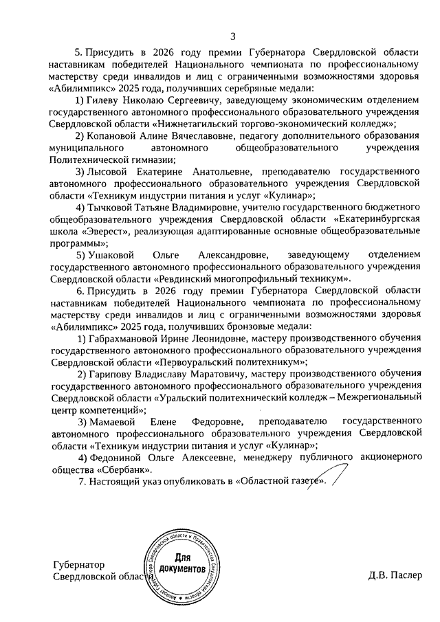 Указ Губернатора Свердловской области от 30.03.2026 N 113-УГ "О присуждении премий Губернатора Свердловской области победителям национальных и международных чемпионатов по профессиональному мастерству среди инвалидов и лиц с ограниченными возможностями здоровья "Абилимпикс" и их наставникам в 2026 году"