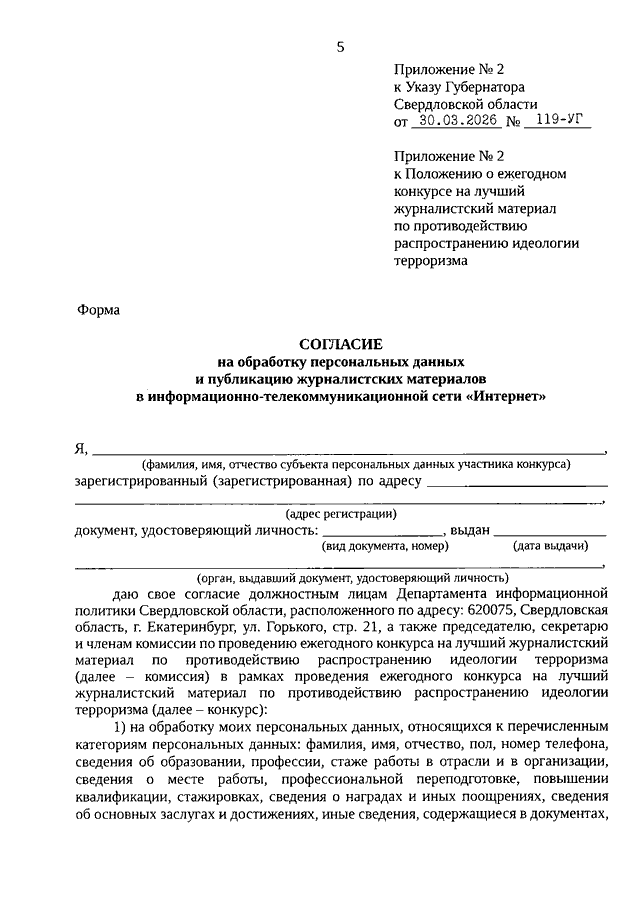 Указ Губернатора Свердловской области от 30.03.2026 N 119-УГ "О внесении изменений в Указ Губернатора Свердловской области от 11.09.2017 N 459-УГ "О ежегодном конкурсе на лучший журналистский материал по противодействию распространению идеологии терроризма"